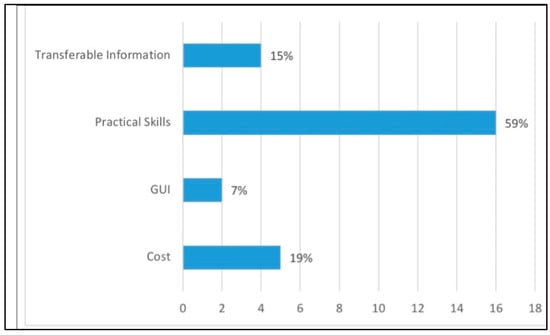 Figure 6 reveals that 35% of the respondents find it easy to use the basic configurations; additionally, 17% found use of VLANs to be easy, 17% found security to be easy, 13% believed that the display commands were easy, and 9% thought the testing commands were easy. Lastly, 9% found routing protocols to be easy. This helps students build network topologies after configuring the associated devices [62]. Ref. [58] revealed that Packet Tracer is sufficient for students’ needs when configuring network devices [61]. This implies that the difference between real devices and simulation tool configurations is insignificant. However, it is essential to note that some features are available on devices that Packet Tracer does not yet support.