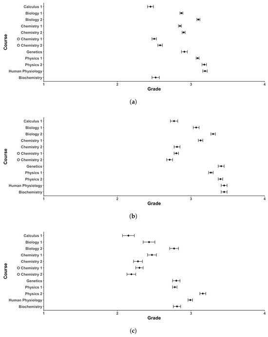 Comparison of student grades for each course of interest for classes before (a), during (b), and after (c) remote instruction due to the COVID-19 pandemic. Ranges represent standard error of the mean.