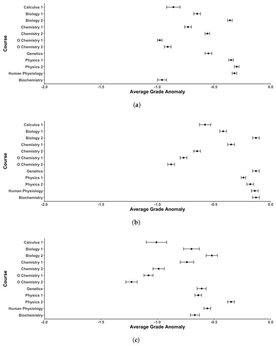 Comparison of student average grade anomalies for each course of interest for classes before (a), during (b), and after (c) remote instruction due to the COVID-19 pandemic. Ranges represent standard error of the mean.