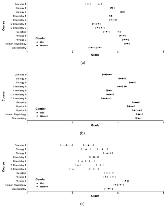 Comparison of student grades for men and women for each course of interest for classes before (a), during (b), and after (c) remote instruction due to the COVID-19 pandemic. Ranges represent standard error of the mean.