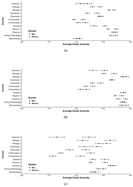 Comparison of student average grade anomalies for men and women for each course of interest for classes before (a), during (b), and after (c) remote instruction due to the COVID-19 pandemic. Ranges represent standard error of the mean.