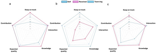 Both self- and peer-scoring during PBL task. The peer evaluation results are presented in three categories: self-rating (Self), ratings from teammates (Received), and the team average (Team Avg). Scores cover areas like staying on track, contribution, expected quality, knowledge, and interaction. (a) A high performer has scores aligning with peer evaluations. (b) An over-confident student rates themselves higher in all aspects compared to peers. (c) A student lacking confidence rates themselves lower than peer evaluations. The graphic shows the student’s self-ratings (blue line), teammate ratings (red line), and team average ratings (dotted blue line) across the evaluated criteria.