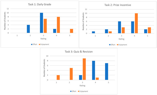 The problems that AW and CK aimed to address with their incremental action research projects were students not enjoying class and not thinking. To address the problem, AW tried two interventions with his 100 eighth-grade students, working in random groups of three, and using non-curricular tasks [5]. Inspired by Jansen, CK tried three different incentives to motivate student completion of test corrections, a daily grade, a prize, and an improved test grade [2]. Both AW and CK surveyed their students to uncover their self-reported enjoyment and thinking. On average, all of AW’s students reported enjoying and thinking during both the group work and the non-curricular tasks. More specifically, on average, AW’s students reported group work promoting the most thinking and the non-curricular tasks promoting the most enjoyment. AW stated that although he “found success with this research study, in the future I could improve on this study by adding more detailed questions in my student survey and trying out different activities.” Similarly, on average, CK’s students reported that the incentives motivated them to complete test corrections. However, on average, students associated low thinking and low enjoyment with the daily grade, high enjoyment and low thinking with the prize, and high thinking and low enjoyment with the improved test grade. CK created the graphs in Figure 1 to summarize his results. From left to right, students’ ratings for the daily grade, prize, and increased test score incentives. Blue represents students’ ratings for thinking or effort. Orange represents students’ ratings for enjoyment. Likert scale ratings from 1 to 5 were used, with 1 representing “not at all” and 5 representing “very much.”