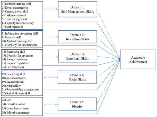 To enhance comprehension, the previously organized four domains, including one with two subdomains, were restructured into five distinct domains. This study focused on 26 non-cognitive skills categorized into five domains: Domain 1, self-management skills (7 skills); Domain 2, innovation skills (4 skills); Domain 3, emotional skills (5 skills); Domain 4, social skills (6 skills); and Domain 5, identity (4 skills). These skills were assessed using a comprehensive survey comprising 180 questions adapted from validated instruments. To alleviate the burden on teaching staff, who were required to assess each student individually, the teacher survey was designed to focus on non-cognitive skills at the domain level. Student self-assessment and teacher assessment scores of these skills are key independent variables used to explore their impact on academic achievement, encompassing performance in two STEM subjects, i.e., math and physics, and two non-STEM subjects, i.e., first language and history. This study explored three primary relationships: (1) the direct impact of students’ self-assessment of non-cognitive skills on academic achievement in STEM versus non-STEM subjects, (2) the mediated impact of teachers’ assessments of these skills on the relationship between student self-assessment and academic achievement across STEM and non-STEM subjects, and (3) the total effect of students’ self-assessment of non-cognitive skills on academic achievement in both STEM and non-STEM subjects.