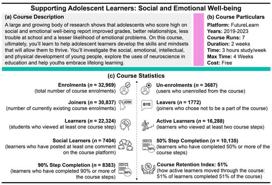 Course description, particulars, and statistics. (a) The ‘Supporting Adolescent Learners: Social and Emotional Well–being’ course description presented on the course landing page (see [26]); (b) the course particulars indicating course timing, runs, and cost; (c) course statistical data including a description of the FutureLearn language (see [29]).