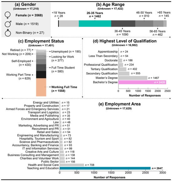 FutureLearn collects student demographic data via a survey upon registration with the platform [30,31]. As the survey is optional, limited information was collected, as only 25% (n = 5513) of learners voluntarily responded to the demographic questionnaire. Of the respondents, 65% were female, 47% were aged 45 years or less, and 28% were employed full-time (see Figure 2a–c). Nearly half (44%) held a bachelor’s degree as their highest level of qualification, and 48% were employed within the teaching and education sector (see Figure 2d,e).