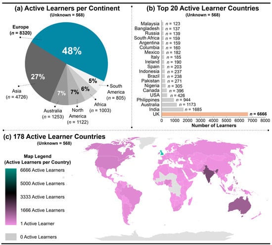 The MOOC had an extensive international geolocational reach. FutureLearn detected the 16,288 active learners’ (see Figure 1c) country of origin through the IP address of their computers when they enrolled in the course, with n = 568 remaining unknown. The majority of active learners were from Europe (n = 8320, 48%) and Asia (n = 4726, 27%) (see Figure 3a), and the top three countries included the United Kingdom (n = 6666), India (n = 1685), and Australia (n = 1173) (see Figure 2b). Active learners were identified to originate from 178 countries overall, with Figure 3c highlighting the extensive geolocational reach of the MOOC.