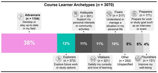 When learners enrol in a course, they are sent an optional multiple-choice survey to determine their ‘archetype’ [30]. A learner’s archetype reflects their motivation to undertake the course that they have enrolled in [29]. Career-based archetypes encompassed 50% of the learners in this course, with advancers (38%), who enrol for professional development, being the most common. The proportion of each archetype alongside the multiple-choice options provided within the optional survey is presented in Figure 4.