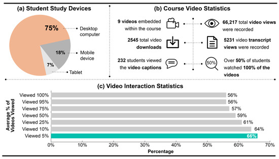 Student devices and multimedia interaction. (a) The devices students used to study the course; (b) course video statistics; (c) the video interaction statistics.