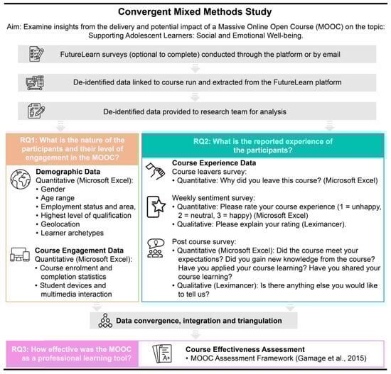 A convergent mixed methods study was conducted by analysing quantitative and qualitative survey data collected at various course stages, followed by triangulation [33] to provide evidence for assessing the MOOC’s eLearning effectiveness (see Figure 6).