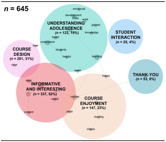 Learners could opt to respond to an optional weekly sentiment survey at the end of week one of the course to rate their course experience (1 = unhappy, 2 = neutral, 3 = happy) and explain their rating through a free-text response [30] (FutureLearn, 2022). Of the n = 1788 responses, 93% (n = 1667) were rated as happy, 6% (n = 102) were neutral, and 1% (n = 19) were unhappy. The mean rating was 2.9 (SD = 0.3, Mode = 3). The free-text responses (n = 645) explaining these ratings were analysed using Leximancer to identify the dominant themes within the responses (see Figure 8). The dominant themes included informative and interesting, course design, course enjoyment, understanding adolescence, thank-you, and student interaction. Each of these themes will now be contextualised in turn.