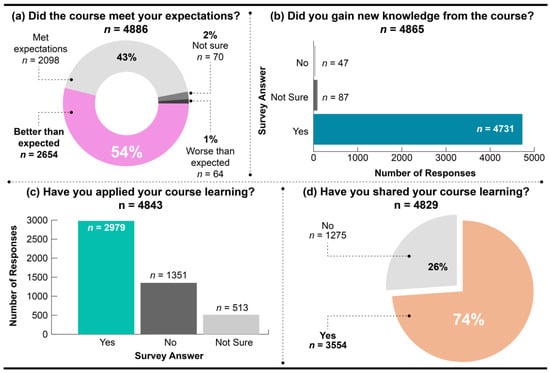 Following the completion of a FutureLearn course, learners are sent an optional post-course survey consisting of multiple-choice (quantitative feedback) and a free-text response (qualitative feedback) questions [29]. To address the quantitative responses, the multiple-choice questions indicated that most (97%) respondents found the course to be better than expected or that it met their expectations (see Figure 9a). The majority (97%) also reported that they gained new knowledge from the course (see Figure 9b), 62% had already applied knowledge from their course at the time of the survey (see Figure 9c), and 74% had shared learning from their course with others (see Figure 9d). The qualitative feedback will now be discussed.