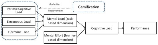 The cognitive load theory (CLT), which was created by Sweller and Chandler, helps instructional designers create lessons that minimize the cognitive load, that is, the amount of mental energy that students must use. The theory holds the notion that an instructional design should minimize cognitive load in order to improve learning []. It makes a further distinction among intrinsic, extraneous, and germane cognitive loads, as shown in Figure 3.