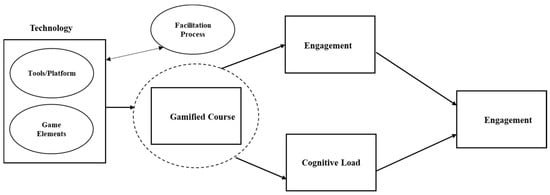 Figure 4 opines that a gamified course module (gamification) is expected to motivate students to learn and also reduce their cognitive load to ultimately engage them in learning. The dotted line suggests that the gamified course is encapsulated in other factors. In other words, the gamified course is implemented using technology and facilitation process or delivery methods. The technology comprises tools and platforms such as learning management systems and incorporates game elements such as Points, Badges and Leaderboards.