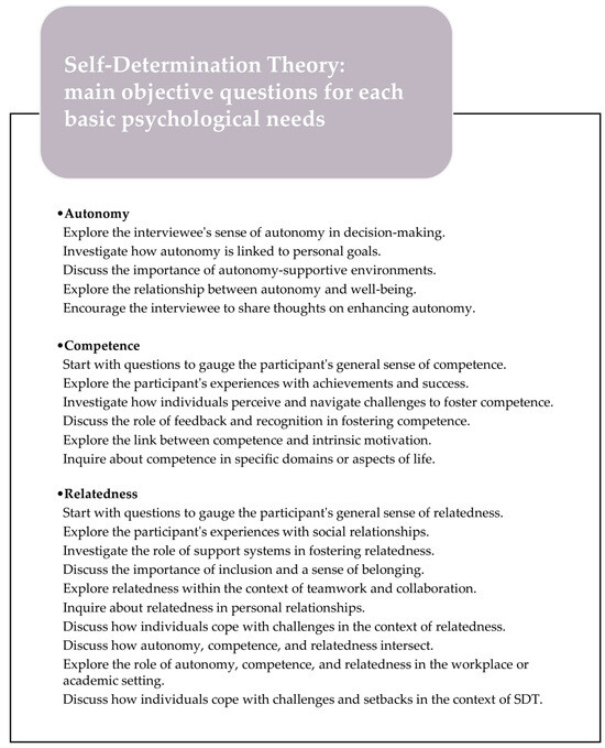 The next figure (Figure 1) presents the main objective questions and defines each basic psychological need according to the autonomy, competence, and relatedness structure to ensure a comprehensive and structured approach to understanding the motivations and experiences of female entrepreneurs.
