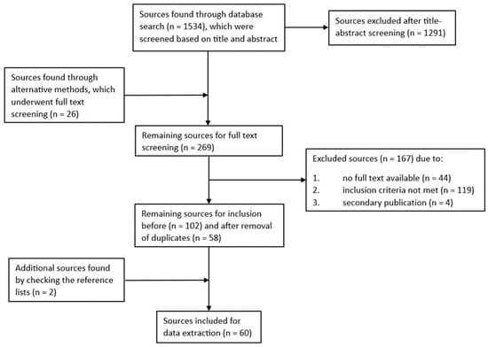 The search of the five databases using the predetermined search strings led to the identification of 1534 potential sources. These were then screened based on their title and abstract. Each article was independently evaluated by two reviewers (first author and third author or first author and fourth author) using a colour system (green = inclusion, yellow = unsure, red = no inclusion). The screening process was systematically organized using Excel. For the title–abstract screening phase, the inter-rater agreement was calculated using Cohen’s Kappa, which is the agreement adjusted for chance. The formula of Cohen’s Kappa is as follows: κ = (p0 − pc)/(1 − pc). Here, p0 is the measured agreement value of the two estimators and pc is the randomly expected agreement. The computation resulted in a moderate agreement (κ = 0.44) [33]. At the same time, it should be emphasised that in only 3.3% of cases, there was a red/green combination, meaning one reviewer advocated for inclusion and the other for exclusion. The green/yellow (inclusion and uncertain) combination occurred in 4.9% of cases, and in 12.5% of cases, the yellow/red (uncertain and exclusion) colour combination was present. Therefore, the initial agreement was 79.3% of cases. In the event of a disagreement, the third person (third or fourth author) was consulted to reach a decision. Subsequently, 243 sources remained that were screened based on the full text. In addition, 26 sources were found through means other than the database search and were also reviewed based on the full text. Here, evaluations were again undertaken independently by two reviewers, making the same assessment in 94.2% of cases. This resulted in a Kappa coefficient of κ = 0.89, reflecting almost perfect agreement [33]. Supplementary Material Table S2 displays the search strings as well as the number of remaining sources after both title–abstract screening and full-text screening for each database. Out of these 269 sources, which included articles, dissertations, book chapters, and conference papers, 167 were excluded as they either did not meet the inclusion criteria (n = 119), were a secondary publication (n = 4), or were unavailable in full text (n = 44). From the remaining 102 sources, duplicates were removed, resulting in 58 included sources. The analysis of the reference lists of the included sources led to the discovery of two additional relevant articles, resulting in a total of 60 identified sources. Some 60 were published in English and 0 in German. Figure 1 illustrates the process of study search and selection using a flowchart in accordance with PRISMA-Scr guidelines [30].