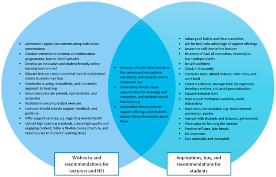 As shown in category six, there are differences between face-to-face and distance learning programmes, which come with certain advantages and disadvantages. Category seven presents the advantages and positive aspects that students experience during the transition into DE. To better classify these aspects, the main category was further divided into three sub-categories: advantages related to the HEI, advantages associated with both the HEI and students, and advantages primarily related to the students. A Venn diagram, which is depicted in Figure 3, shows the allocation of the different advantages to the three sub-categories.