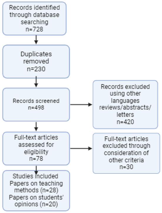 Finally, after the application of the inclusion and exclusion criteria, 48 articles were chosen for the literature review as they fulfilled all the stated requirements. The process followed for selecting the articles is summarized in the PRISMA diagram (Figure 1). We emphasized important data and results, focusing on the pros and cons of each teaching method and their limitations. The articles were grouped as follows: