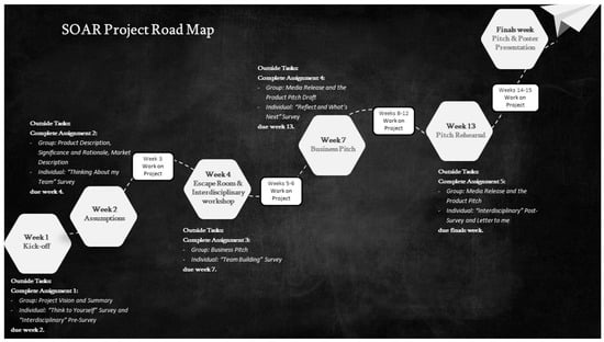 We incorporated evidence and guidance for effective practices into the design of the SOAR project—an interdisciplinary project-based learning initiative that engages a team in bringing a product to market. These projects centered around a prototype developed by electrical engineering students (e.g., an airfoil glider electricity generating system, a current calibration coil). The SOAR project emulated an industry setting with a series of assignments, multiple checkpoints, and feedback. This project also allows students to develop team-building abilities and collaboration skills. Throughout the semester, students are asked to reflect on their group’s interdisciplinary collaboration and project overall (see Figure 1 for project timeline, deliverables, and surveys). Students had to complete four modules; each module required specific group tasks along with rubrics. Groups needed to: