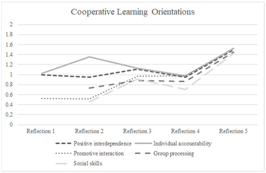 Upon analyzing the data, we identified notable increases in all five cooperative learning orientations over time, although the change was not consistently linear when examined collectively. During the initial survey, we observed some evidence of positive interdependence, individual accountability, and limited indications of promotive interaction among the participants. Following a team-building activity conducted during the third reflection, we detected significant improvements in positive interdependence, promotive interaction, group processing, and social skills. By the time of the final reflection, coinciding with the submission of the final group work, we witnessed substantial and demonstrable increases in all cooperative learning orientations. These trends indicate a clear pattern of enhanced cooperation resulting from continuous engagement in interdisciplinary group projects (for descriptive statistics, refer to Table 5, and for a visual representation of the cooperative learning orientations over time, consult Figure 2).