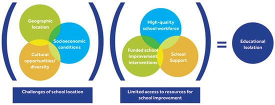 The Educational Isolation concept has three combined place-based elements that constitute the schools’ location: geographical remoteness, socioeconomic disadvantages, and cultural isolation (from cultural opportunity and diversity). These elements act to limit a school’s access to the resources required for school improvement []. These resources include school support and staff development, access to external funding for educational interventions, and a high-quality workforce (see Figure 1).