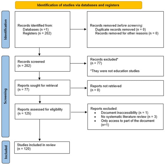 Phase (4) discusses the process of selecting studies. The initial search yielded 202 dissertations. After an initial analysis, 77 records were excluded because they did not concern research of an educational nature or were not carried out in such settings, leaving a final sample of 125 documents. These documents were analyzed independently, and five were excluded for various reasons. In the end, the SLR enclosed a sample of 120 documents. To facilitate the understanding of this procedure, a flowchart developed within PRISMA 2020 was included, as shown in Figure 1 [,].