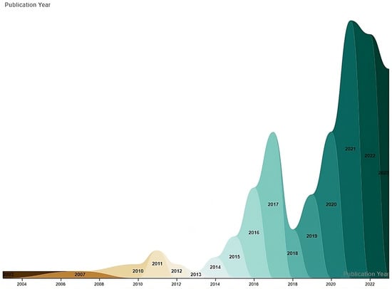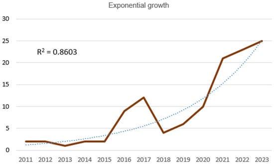 The 120 documents analyzed were published between 2007 and 2023. There was no continuity in publications between the first thesis published in 2007 [] and those published in 2011 [,]. However, from the latter until 2023, annual publications were observed to be uninterrupted and to follow an exponential growth trend with a good fit to an exponential growth relationship of R2 = 0.8603 (Figure 3).