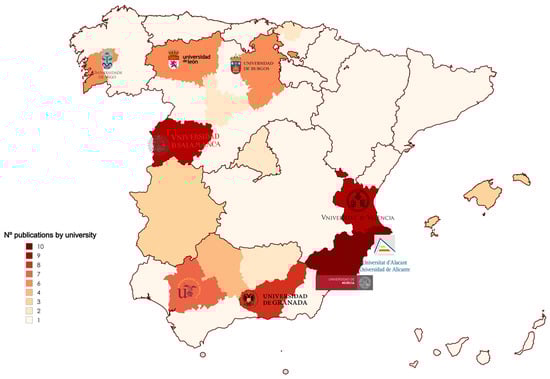When analyzing the universities where doctoral theses using SLR as a part of the research process in education are published, it was found that the two most productive universities are the University of Murcia and the University of Alicante, with 10 records each, while other universities such as Salamanca and Valencia (9), Granada (8) and Seville (7) are also important (Figure 4).