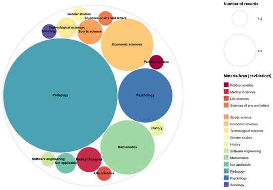 Likewise, among the areas or subjects in which most doctoral theses are published, “Pedagogy” stands out, accounting for more than half of the revised documents. This area is closely linked to the improvement of educational systems and the quality of teaching and covers a wide range of subtopics and research approaches related to the teaching-learning processes, evaluation, didactics, educational management, the use of innovative and active methodologies, inclusion, etc. Additionally, the constant transformation of educational systems due to the incorporation of new technologies, the changes concerning educational policies and curricular reforms, as well as the greater interest in improving teacher training may explain the increase in the production of doctoral theses in this field, as authors like Sebastián [] and Shin et al. [] affirm. Linked to this, it was not surprising that the main research topics correspond to educational technology and digital literacy in education, given the intention of adapting to those changes that technology promotes in social and academic terms. However, areas such as “Sociology”, also close to educational purposes, showed very few records, while others such as “Economics”, which apparently would be more detached from them, are in fourth place.