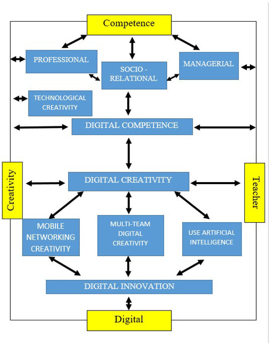 - In turn, digital competence knows as many fields of manifestation as there are professional possibilities of objectification, which leads us to one of its subcategories that is of interest to us, respectively teacher digital creativity—“teachers’ digital creativity and instructional creativity were operationalized to reflect their creative behavior in digital and instructional activities” [24], p. 584. In the 21st century, it becomes a necessary dimension, that is achievable but, above all, extremely in demand, desired, and appreciated in didactic activities by the new generations from preschool to university level [66]. Didactic competence reconfigures its structure, especially after the pandemic, assuming a happy and balanced (re)combination of pedagogical competence with the digital one, which can impact the entire educational approach, at the level of all its components, through digital creativity: goals, created contents, didactic applications, activities carried out, creative self-expression. “Teachers’ digital creativity was indicated by their creative creation of digital applications and online activities, their participation in creative behavior involving the use or creation of digital materials at schools, and their digital creative behavior in expressing their thoughts, emotions, or interests”. [idem]