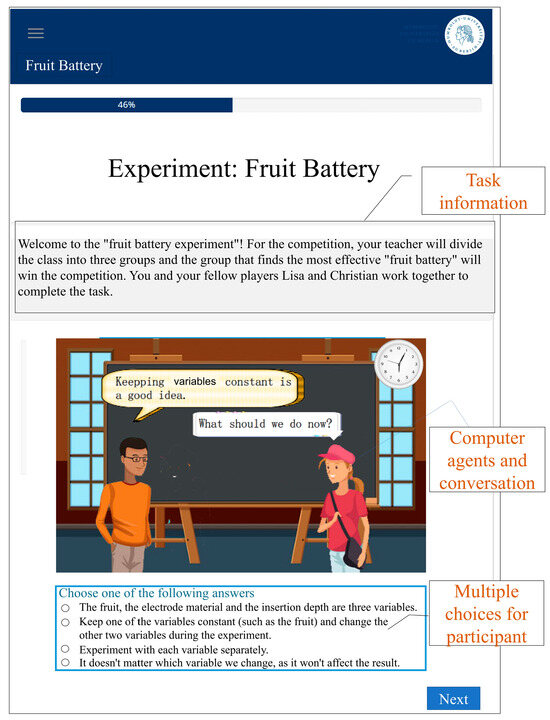 Figure 1 shows an example interface where computer agents appear sequentially in animated form to provide information to the student. The student interacts with the computer agents by selecting one of the options presented in the area below. After choosing an option, the student can click the ‘Next’ button to move to the next scenario. In the task example, two agents and the participant discuss the experimental procedure. One agent, Lisa, asks what to do next. In this situation, the correct response is to control two of the variables while changing the remaining one (Option 2). If the participant selects this option, he will receive 2 points and proceed directly to the next item. However, if the participant chooses either the first or third option, he will receive 1 point, as these choices indicate a willingness to co-operate and provide input but do not constitute the correct proposal. Selecting the fourth option results in 0 points because the computer agent Christian has already suggested keeping the variables constant, and the participant’s response contradicts this suggestion. In both cases, the computer agent will intervene in the next scenario to indicate that the participant’s choice was incorrect. The purpose of this is to allow students to reflect on their collaborative process in a timely manner, as formative assessment and collaborative teamwork are positively correlated with each other [25,63].