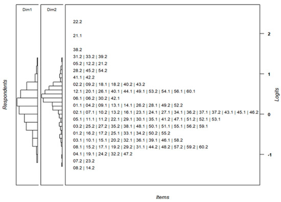 To ensure the validity and reliability of the assessment tool, we scaled raw scores using Multidimensional Item Response Theory (MIRT) models in R 4.2.1 [64]. The Generalised Partial Credit Model (GPCM) [65] was employed for rating the item scores. Figure 2 [66] provides a Wright Map that delineates the alignment between the CPS skills of participants from Germany and China and the corresponding assessment items, plotted along a shared logit scale. The Wright Map, also known as a person-item map, is a graphical representation used in item response theory to visualise the relationship between the abilities of respondents and the difficulty of assessment items [67]. This map is beneficial for this study as it allows for the clear comparison of participant skills and item difficulties on the same scale, facilitating the identification of gaps and overlaps in the assessment. The map is divided into two dimensions: the first one (Dim 1) visualises the distribution of German students’ CPS skills, and the second one (Dim 2) the same for Chinese students. The logit scale, used in item response theory to represent the natural logarithm of the odds of a correct response, typically ranges from −3 to +3 logits on a Wright Map, depending on the assessment and population [67]. The participants’ CPS skills range from −1.25 to 1.32 logits, indicating a wide spectrum of CPS skills and ensuring the assessment can accurately measure both lower and higher ability respondents. Assessment items are methodically arranged throughout the graph to align with the anticipated progression in CPS complexity. More challenging items, e.g., 21.1 and 22.2, are located towards the upper end of the graph, suggesting a higher level of difficulty. In contrast, items like 08.2 and 14.2 are positioned at the lower end, denoting more basic CPS tasks. This systematic distribution across the range of student skills confirms the robust quality of the assessment and its ability to differentiate between varying levels of CPS proficiency.
