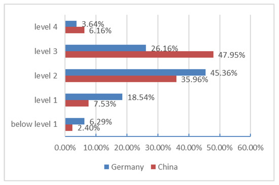 The bar graph in Figure 4 [66] reveals that a small but significant proportion of students achieved the highest level of CPS competency (Level 4), with Chinese students (6.16%) outnumbering their German counterparts (3.64%). This upper echelon of CPS proficiency is marked by the ability to handle highly complex tasks and to solve problems that involve multiple constraints and relevant background information. However, a substantial contrast is observed at the ‘below Level 1’. 6.29% of German students fall below Level 1, indicating a challenge in foundational CPS skills within this group, compared to 2.40% in China. The majority of students from both countries are situated at Level 3, with nearly half of the Chinese cohort (47.95%) demonstrating proficiency in moderately complex CPS tasks, outpacing the 26.16% observed among German students. These distributions reflect the respective educational frameworks’ effectiveness in cultivating CPS skills.