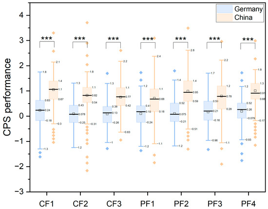 Comparison of CPS sub-dimensions between two countries. CF1: establishing and maintaining a shared understanding; CF2: taking the appropriate action to solve the problem; CF3: establishing and maintaining team organization; PF1: exploring and understanding; PF2: representing and formulating; PF3: planning and executing; PF4: monitoring and reflecting. *** p < 0.001: The difference is significant at the 0.001 level.