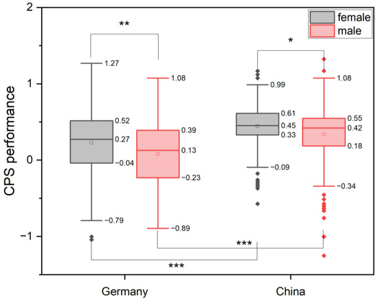 Regarding gender differences, Figure 6 shows comparative results. Statistical analyses revealed significant gender differences within both German (Mann–Whitney U = 9068.0, p = 0.003, |Cliff’s Delta| = 0.20) and Chinese (Mann–Whitney U = 7381.5, p = 0.02, |Cliff’s Delta| = 0.17) students. In the German group, female students had an average CPS score of M = 0.23 (SD = 0.41), which was notably higher than that of their male counterparts, who had an average of M = 0.08 (SD = 0.44). Similarly, in the Chinese group, female students outperformed male students, with average scores of M = 0.44 (SD = 0.33) for females and M = 0.37 (SD = 0.39) for males. Consistent with the results reported in PISA 2015, female students in our sample demonstrated superior CPS performance compared to male students [6]. This observation may be attributed to the tendency of females to navigate collaborative scenarios, maintain group dynamic awareness, and engage in conflict resolution [6,27]. Notably, gender comparisons between countries showed that both Chinese males and females outperformed German students (Mann–Whitney Ufemale = 8977.0, p = 0.000, |Cliff’s Delta| = 0.32 and Mann–Whitney Umale = 19,673.5, p = 0.000, |Cliff’s Delta| = 0.37). These results suggest that interventions to enhance CPS should be tailored to address gender-specific learning needs and preferences.