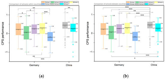 Comparison of CPS skills in schools within (a) and between (b) countries. *** p < 0.001: The difference is significant at the 0.001 level. ** p < 0.01: The difference is significant at the 0.01 level. * p < 0.05: The difference is significant at the 0.05 level.