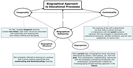 Through the elements of temporality, contextuality, and biographical reflexivity inherent in biography and used for the analysis of educational processes [37], individuals construct and reconstruct their stories. Temporality refers to the nonlinear ordering and reordering of events and construction of knowledge and can include detours, interruptions, revisions, and repeated processes. As Alheit [37] explains, because temporality includes both the required level of qualifications and education that are structured according to the social context and individuals’ own time structure formed and reformed through experiences and perspectives relating to biographical subjects and social groups, biographical research allows an elaborated analysis of the dimension of lifelong learning. Contextuality has a profound effect on one’s biography, requiring “consideration [of] the interaction between institutional structures and societal conditions on the one hand; and the course of education shaped by the actions, experiences and interpretations of the biographical subjects on the other” [37] (p. 14). Biographical reflexivity—including biographical structure and biographicity—allows for a biographical sum of knowledge or the construction of experiences over a period of time (biographical structure). What is constructed is dependent on the available tools and options for action (i.e., first attempts, repeated attempts, mistakes, revisions, and communicative space for individual and group reflection). Thus, since a biography is formed not only through learning but also impacts reflexively back on the same learning processes, biographicity supports our understanding that the tacitly understood logic of the already formed biographical sense structures subsequent actions and interpretations of a subject. For example, if a TC was previously placed in language learning contexts where she was immersed in only the target language to learn it best, it would make sense that she experienced some cognitive dissonance when subsequently told that strategically and interchangeably using more than one language at a time while learning a new language was not only acceptable but also normal and beneficial. Moreover, if the same TC later learned in her TESOL courses that the best way to acquire a new language was to be immersed in only that language, this previously unquestioned approach may lead her to misinterpret or experience tensions regarding new ideas (e.g., “But that’s not how I learned” or “That’s not what [a different professor] said last semester”). However, the consideration/movement among past–present–future, along with the experiences, competencies, and routines that comprise(d) those timepoints, open possibilities for both narrowing and enabling continued learning [37]. Figure 1 illustrates the interconnectedness of various aspects of the biographical approach.