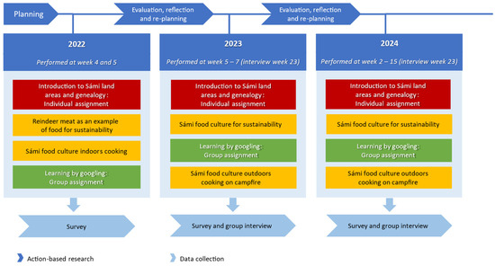 This research was inspired by action research and pedagogical research, which aim to improve and further develop the teaching practice [,]. Action research is a cyclic process with four steps: (1) planning, (2) execution, (3) observation and evaluation, and (4) reflection to plan an improved cycle [,]. In the course of three years (cycles), we aimed to improve our teaching about Sámi culture with a participatory design that included student voices.