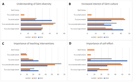 Students’ responses to questionnaire items (y-axis) rated on a five-point Likert scale indicating their self-reported degree of (A) increased understanding of Sámi diversity, (B) increased interest in Sámi culture, (C) the importance of the teaching interventions, and (D) the importance of self-effort. The results (x-axis) are shown as percentages of students (2022: n = 23; 2023: n = 20; 2024: n = 7). (A,B) shows the students’ evaluations of the teaching content, while (C,D) provides information about the teaching methods.