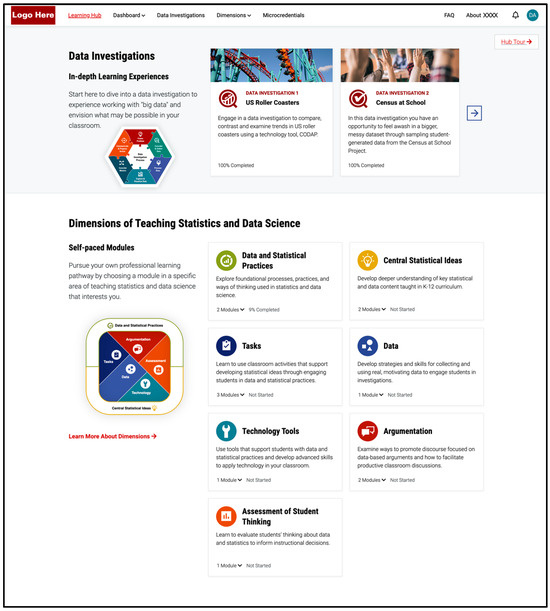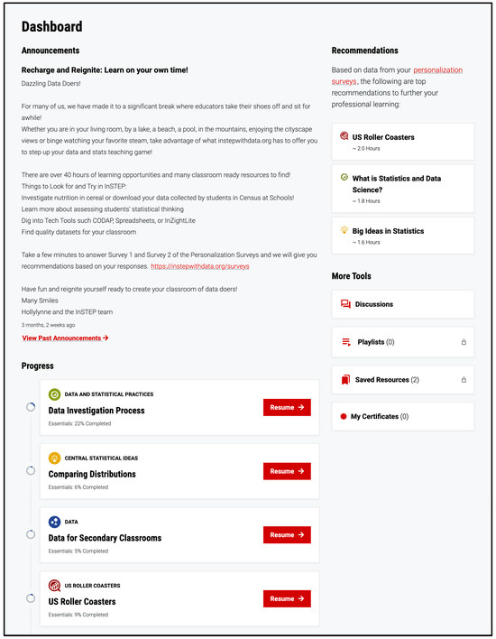 Some members of the author team (Lee and Mojica) designed and implemented three educator-specific MOOCs aimed at developing expertise in teaching statistics using rich data-enabled experiences. Teachers from around the world engaged in these courses and have reported changes in their statistics teaching practices to include larger real datasets and using an investigation process [26,27]. Unequivocally, teachers’ confidence to teach statistics drastically increases after engaging in the courses [27]. Many educators did not complete an entire course but instead only engaged in the first 1–2 units (of 5) of a course. Reasons for this pattern of engagement were often that they did not have time to complete a course or were looking for more resources to help learn statistics themselves. Some teachers indicated in follow-up surveys that although they did not finish a course, they learned how teaching statistics involves a cycle and habits of mind and found resources for their classroom that met their needs [28]. Deng and colleagues [29] analyzed patterns of engagement across many MOOCs and classified users in three general categories of engagement: (1) individually engaged users typically enrolled in MOOCs of shorter duration and were highly engaged with completing only a small portion of a course; (2) least-engaged users who also only completed a subset of the course but with mid to low levels of engagement over time; and (3) wholly engaged users who were motivated by the course goals, were highly engaged, and had a high rate of completion. These three patterns are similar to those found by Wiebe and colleagues [30] in MOOCs specifically designed for educators. In their review of MOOCs, Davis and colleagues [4] noted that the designs of typical MOOCs do not account for a learner’s past behavior in delivering personalized content, and they suggested that developing and implementing adaptive, personalized systems in MOOCs could make them more adaptable and able to cater instruction based on individual learners. Results such as these led our team to envision a different online professional learning experience for teachers, which led to the InSTEP platform.
