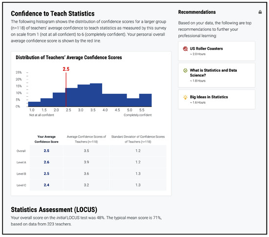 Recommendations are a critical aspect of the personalization features we designed into the platform and are used to investigate RQ3. Our approach to designing the recommendation system aligns with others who used ontology-based recommendation systems, specifically in platforms designed to support learning (e.g., [56,57]). “Most knowledge based e-learning recommender systems use ontologies to represent knowledge about the learner and learning resources. In such a case, ontology is used to establish the relationship between learners and their preferences about the learning resources” [57] (pp. 30–31). Our recommendation system is based on user inputs, including both psychological aspects (ranked goals and confidence to teach statistics) with cognitive aspects of a user’s knowledge of statistics content typically taught in secondary schools. As designers of the learning experiences and experts in research on teachers’ professional learning in statistics and data science, we created a mapping system to align certain goals, levels of confidence, and statistics knowledge to specific learning experiences in the platform.