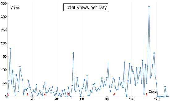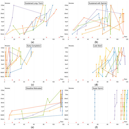 Our second research question (RQ2) focused on ways in which participants engaged with learning materials. Through analyses of page views and completion patterns, there was evidence that our case of users had overall sustained engagement in the InSTEP personalization platform. Over the study’s period, about 120 days, the teachers were engaged in viewing learning materials. We used a qualitative approach to classify users into different groups using their time series graph of when entire modules were marked as complete. We identified six engagement patterns that help better understand how participants can engage with a personalized online professional learning platform. We consider most of these patterns as representing sustained engagement just over different time periods (see Figure 6). The Super Sprint users were not considered to have sustained engagement as they completed all their modules within a few days. As many researchers have suggested, sustained engagement is considered a key feature of effective professional learning, whether online or in person [58,59,60,61]. Within research on MOOCs for educators, methods such as latent profile analysis have shown that teachers’ engagement patterns over time are typically classified as consistent high engagers; mid-level engagement, which drops off near the end of a course’s time period; and sharp drop offs for those that start a course and quickly have low to no engagement (e.g., [30,51]). The variety of completion patterns from this case study suggests that users utilized the personalized nature of the platform to engage when they wanted and for the length of time that worked best for them. Having a flexible format in an online professional learning environment where teachers can choose their learning pathways and have extended time to complete materials has been linked to a higher sustained engagement and completion certificates for teachers [62].
