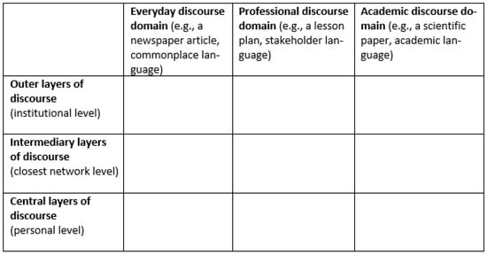 Mary Macken-Horarik et al. [12] extended Northedge’s discourse categories to the field of teacher education from a systemic functional linguistics perspective [26]. They redefined these categories as discourse domains: the everyday discourse domain, the professional discourse domain and the academic discourse domain. In their study, Macken-Horarik et al. [12] focused on language use by describing the academic discourse domain as characterized by the scientific and formal language found in texts such as research papers. The professional discourse domain, on the other hand, is marked by practical language related to professional practice and experience, such as lesson plans. Lastly, the everyday discourse domain is characterized by informal, common-sense language that can typically be found in mass media texts. Originally rooted in the perspective of new literacy studies, these discourse domains have primarily been applied in research on writing [27,28]. However, as students’ writing and learning are inherently linked to “epistemic identities” [29] (p. 446), the discourse domain may be used to more generally explore the connection between language use and identity construction in education.
