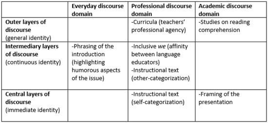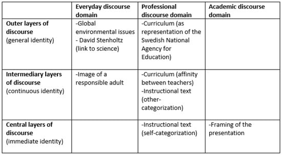 The idea that identity can be both stable and fluid is central to the work of Sigrid Norris, who notes that identity is shaped through actions in interactions, where social actors produce what she identifies as identity elements [18]. These identity elements can be seen as situational identities or pieces of a larger puzzle that together contribute to a person’s identity. These elements can be momentary or enduring and may take a foreground or background role in a person’s focus at any given time [18]. The key point in the context of this study is that identity elements are produced across three different layers of discourse. The three layers identified by Norris [18] (p. 179) are central layers of discourse, intermediary layers of discourse and outer layers of discourse. Each layer connects to specific types of identity elements, distinguished by their persistence. The central layers of discourse are linked to a person’s immediate actions, such as short utterances, and produce immediate identity elements where the intermediary layers pertain to a network level (i.e., a person’s closest network) generating continuous identity elements. The outer layers concern the societal level where larger institutions are found and produce general identity elements. These layers combine in what Norris refers to as vertical identity production—vertical in the sense that identity is studied from individual actions to larger institutional and societal discourses.