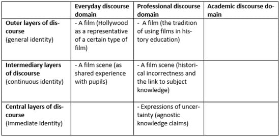 In the outer layers of discourse, the film itself appears to be a useful discursive resource. Asking the pupils if they have seen a popular film directed by Quentin Tarantino could be seen as bringing both him, as the director, and the more general perception of Hollywood into the practice of watching a film. The film, then, functions as a discursive resource connected to the everyday discourse domain. However, the use of fictional or historical films in history education is a well-documented phenomenon in both research and practice [54,55]. By using the film scene, Eric adheres to a well-established tradition of employing the pedagogical potential of films when teaching history. This interpretation is further supported by his awareness of how to use films in the classroom, as shown when he ensures that the pupils understand the film’s historical inaccuracy (line 12: “but it’s completely historically inaccurate, you know”). From this perspective, Eric’s use of the tradition of incorporating films in history education serves as a discursive resource to construct the general identity as a history teacher.