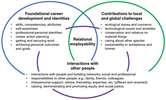 According to Hill et al. [34], critical global citizenship can be achieved through transformative learning and reflection. Lilley et al. [35] contend that global citizen learning (the process of becoming a global citizen) occurs when students are encouraged to step out of their comfort zone, think differently, engage beyond their immediate social environment, and consider “self, life, others, and career, and the world beyond narrow expectations” (p. 241). Relational employability does this by challenging individuals to consider their wider interactions, contributions and possibilities with other humans and more-than-humans throughout their careers.