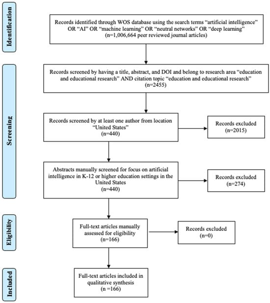 PRISMA flow diagram for systematic review of artificial intelligence articles focused on U.S. educational systems on Web of Science (n = 166).
