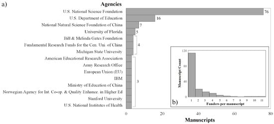 Answering this study’s first research question, Figure 2a,b below displays the top funders of AI research conducted in U.S. educational systems from 2010–2023. Given the data in Figure 2a, the U.S. National Science Foundation (NSF) has been easily the most prominent source of funding for AI research conducted in U.S. educational systems, credited for 76 PRJAs focused on AI in educational research, followed by the U.S. Department of Education, credited with 16 PRJAs focused on AI in U.S. educational systems.