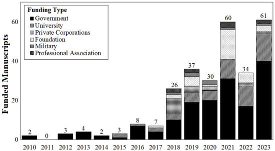 To analyze funding sources, the research team employed R to categorize main institutions and remove all foreign institutions, removing duplicates from the same institution. Then, funders were cleaned down to the primary funding body (i.e., removing a directorate from NSF listings) to form broader categories of funding bodies. We then conducted a fuzzy match and manually cleaned for consistency (i.e., NSF or N.S.F. records became National Science Foundation). Then, once broader categories of funding bodies emerged, the research team manually researched specific classes of funders, including those from governmental organizations (subbranches specifically military, such as Office of Naval Research, the Army Research Office, etc.), universities, foundations, professional organizations, private companies, and one unknown entity (“SHEILA”). This analysis can be found in Figure 2a. To calculate funding statistics per manuscript, the research team performed descriptive statistical analysis by manuscript, comparing the number of funders per PRJA (see Figure 2b). Then, descriptive statistics were calculated by top funders, taking each unique PRJA identifier (digital object identifier or DOI) and calculating the yearly number of PRJAs per funder from 2010 through 2023 (see Figure 2).