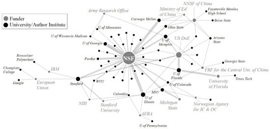 The organizations with the strongest networks were the NSF followed by the U.S. Department of Education. Regarding institutions of higher education, Stanford University, the University of Florida, the University of Illinois, the University of Memphis, and Carnegie Mellon University had the strongest networks, which translated to many of these institutions producing the most PRJAs. Inversely, there were two institutions with direct connections to the NSF (the University of Wisconsin–Madison, the University of Minnesota–Twin Cities) but were also connected to the U.S. Army Research Office, which may suggest that AI funding in military education systems may not yield as many PRJAs or that these institutions are not allowed to publish their results and instead must keep research results internal.